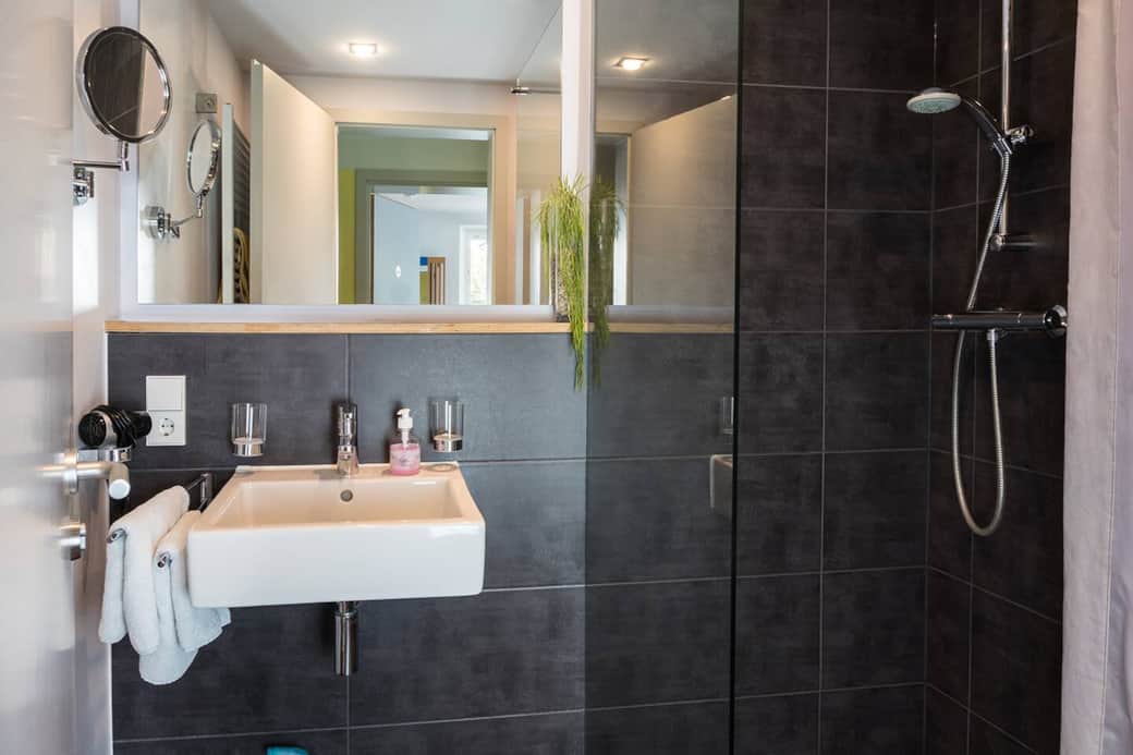 Das eigene Bad mit Dusche/WC liegt direkt gegenüber auf derselben Etage und steht dir allein zur Verfügung.