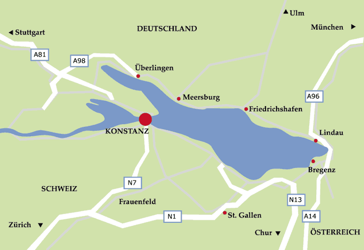via the Meersburg–Constance car ferry, cross the Rhine bridge, follow Untere Laube, then turn into Gartenstraße